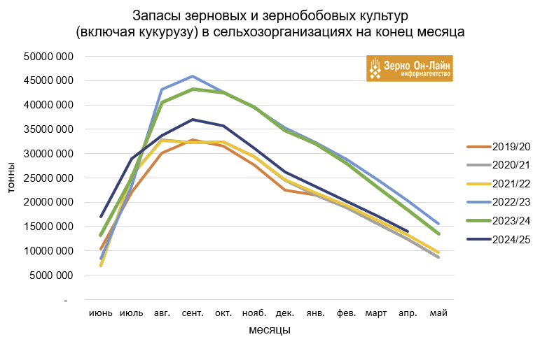 Запасы пшеницы к концу апреля снизились до 7,82 млн т (-32% к концу апреля 2024 г.). Запасы кукурузы выросли по сравнению с прошлым годом на 2% до 1,91 млн т.