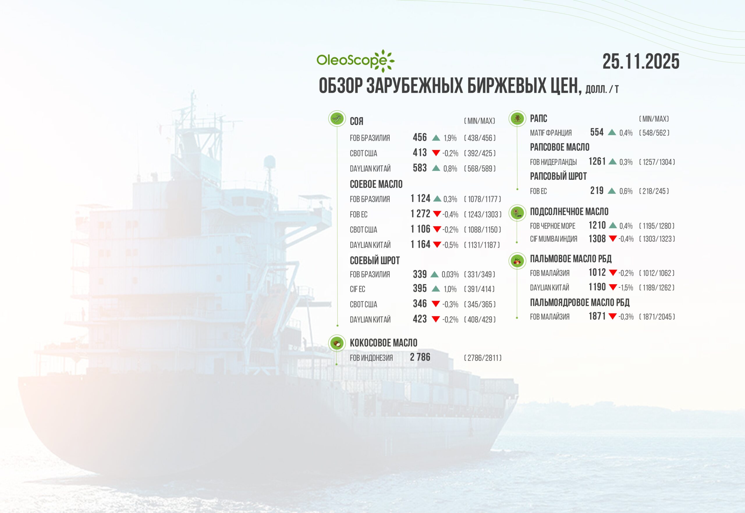 24.11.2025 г. цена на соевое масло (FOB ЕС) с поставкой на ноябрь составила 1272,26 $/т, что на 4,85 $/т ниже предыдущего значения от 21.11.2025предыдущего значения от 1277,11 $/т). Это минимальное значение за неделю.