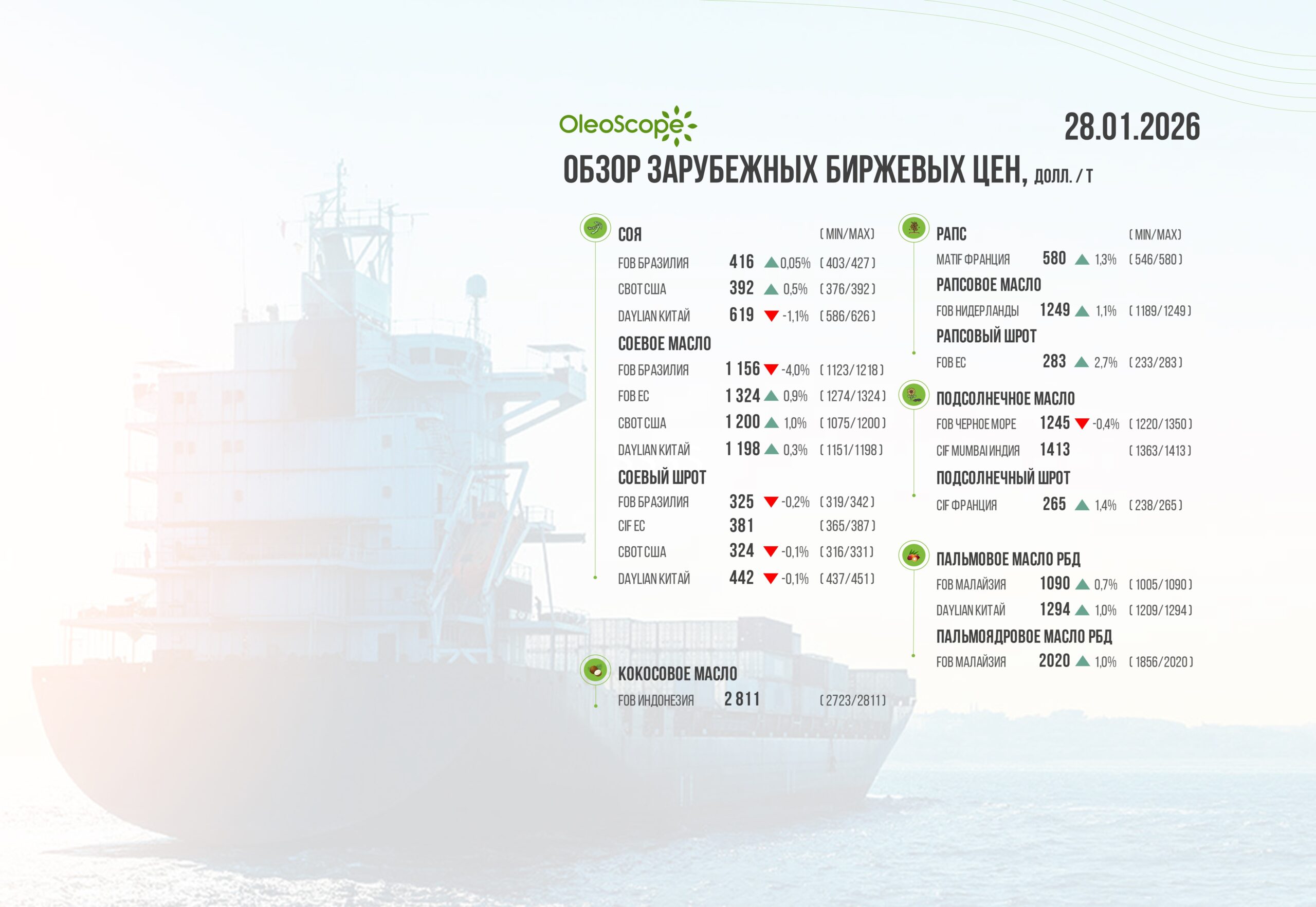 27.01.2026 г. цена на соевое масло (FOB ЕС) с поставкой на январь составила 1323,87 $/т, что на 11,86 $/т выше предыдущего значения от 26.01.2026предыдущего значения от 1312,01 $/т). Это максимальное значение данной цены.