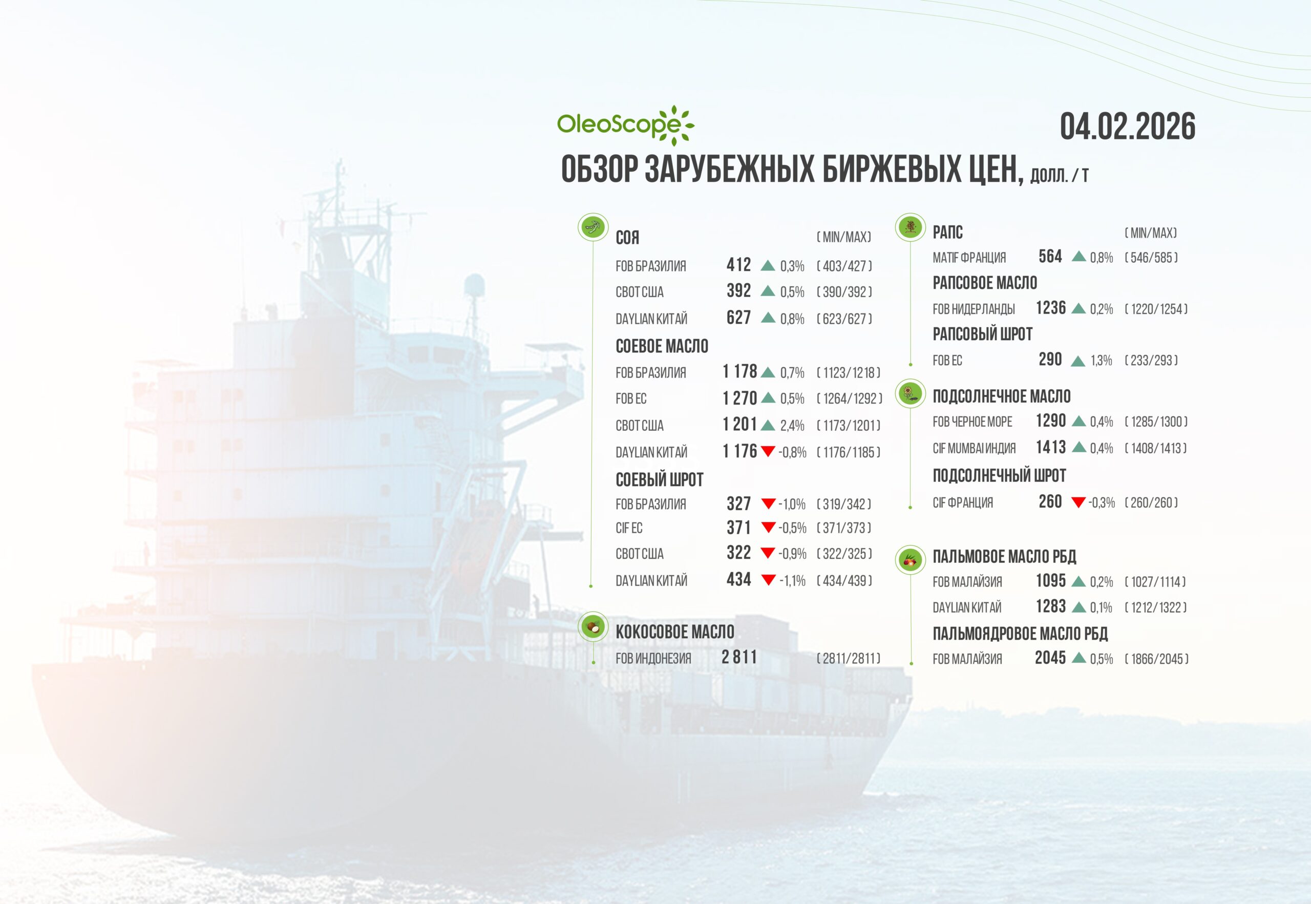 03.02.2026 г. цена на соевое масло (FOB ЕС) с поставкой на февраль составила 1269,91 $/т, что на 6,33 $/т выше предыдущего значения от 02.02.2026предыдущего значения от 1263,59 $/т).