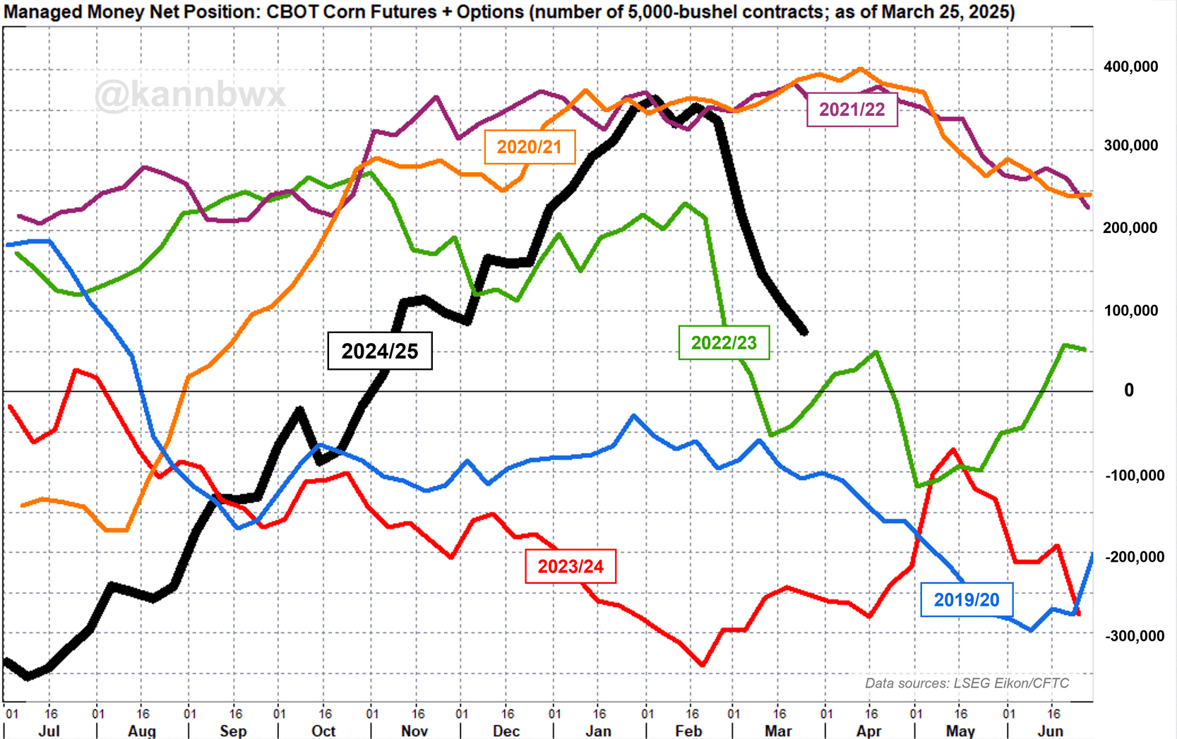 На неделе, закончившейся 25 марта , управляющие финансами сократили чистую длинную позицию по фьючерсам и опционам на кукурузу на CBOT до 74 607 контрактов со 107 270 неделей ранее, что стало для них наименее оптимистичным прогнозом с начала ноября.