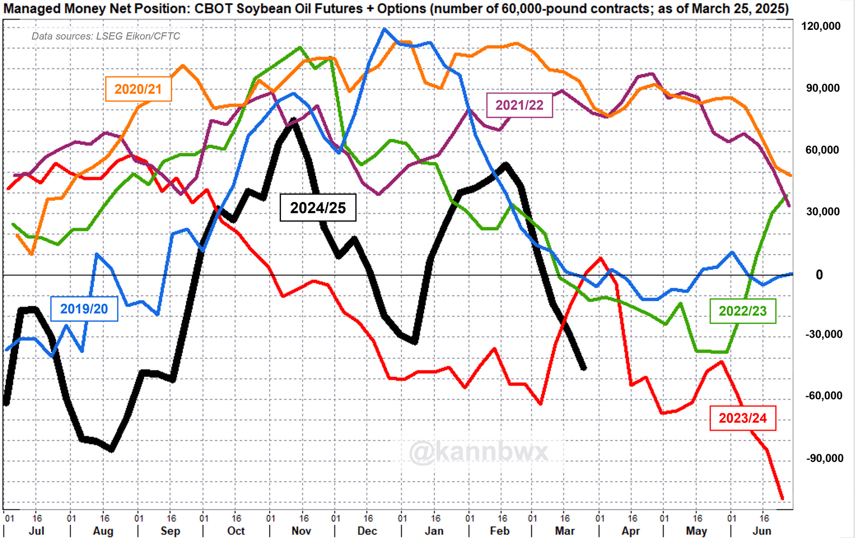 На CBOT по соевым бобам управляющие активами заняли самую медвежью позицию за три месяца, увеличив чистые короткие позиции по фьючерсам и опционам до 42 959 контрактов по состоянию на 25 марта с 22 005 неделей ранее.