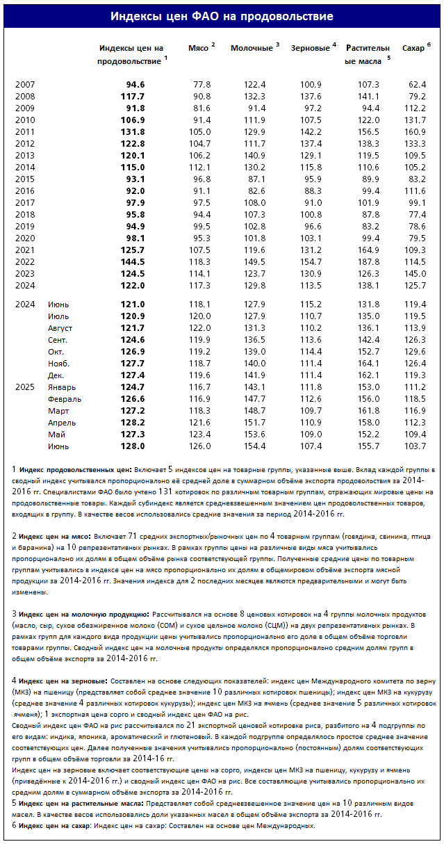 » Среднее значение Индекса продовольственных цен ФАО* (ИПЦФ) в мае 2025 года составило 127,7 пункта, что на 1,0 пункта (0,8 процента) ниже апрельского уровня. Снижение значения индексов цен на зерновые, сахар и растительные масла с лихвой нивелировало рост значения индексов цен на молочную продукцию и мясо. В целом, значение ИПЦФ оказалось на 7,2 пункта (6,0 процента) выше соответствующего показателя прошлого года; однако оно все еще на 32,6 пункта (20,3 процента) ниже его рекордного значения, зафиксированного в марте 2022 года.