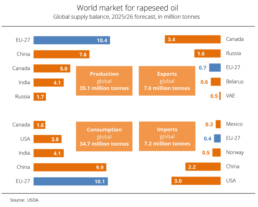 По оценкам Министерства сельского хозяйства США (USDA), мировой объем производства рапсового масла в сезоне 2025/26 составит приблизительно 35,1 млн тонн, что примерно на 1,4 млн тонн больше, чем в предыдущем сезоне. Крупнейшим потребителем является ЕС, потребляющий чуть менее 10,1 млн тонн, за ним следуют Китай с 9,9 млн тонн и Индия с 4,1 млн тонн. США являются крупнейшим импортером рапсового масла, импорт которого составляет 3,0 млн тонн, частично для производства биотоплива. В то время как страны-члены ЕС практически полностью обеспечивают себя рапсовым маслом, Китаю приходится импортировать 2,2 млн тонн.