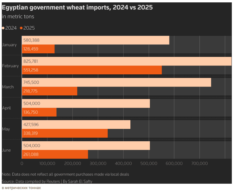 Согласно данным о поставках и торговле, изученным агентством Reuters, Египет импортировал около 5,2 млн тонн пшеницы в первой половине 2025 года, что на четверть меньше, чем за аналогичный период прошлого года. Доля правительства в этом импорте сократилась более чем вдвое, до примерно 1,6 млн тонн. Эта цифра не включает внутренние закупки, если таковые имелись, осуществляемые через посредников или частные компании.