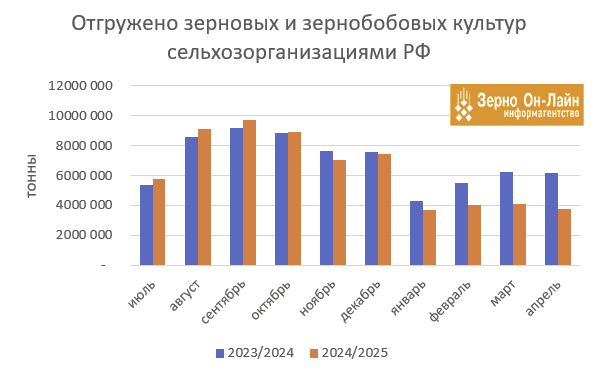 В апреле объем отгрузок зерна составил 3,756 млн т (-39% к апрелю 2024 г.), в т.ч. пшеницы – 2,526 млн т (-39%), кукурузы – 0,4 млн т (-43%).