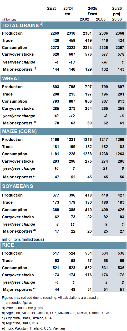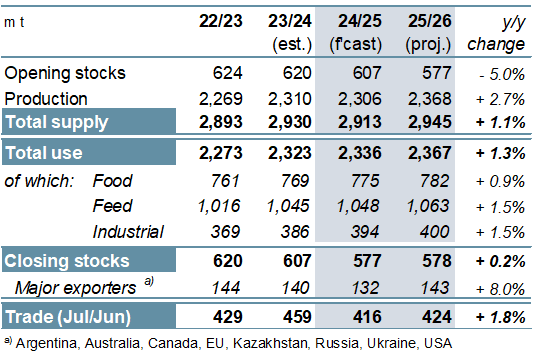 Первый полный набор прогнозов по общему объему производства зерна в 2025/26 году указывает на общий рост производства, во главе с кукурузой, но также и на рост производства пшеницы и ячменя. Поскольку рост производства лишь частично компенсируется низким уровнем начальных запасов, ожидается увеличение общего предложения на 1%. Несмотря на рост потребления, прогнозируется, что переходящие запасы вырастут, поддерживаемые накоплением в основных странах-экспортерах. Ожидается, что торговля восстановится, но останется значительно ниже предыдущих пиков.