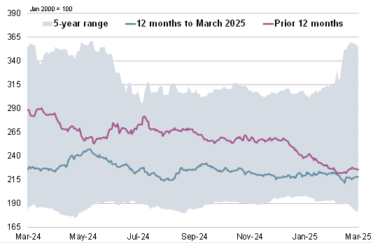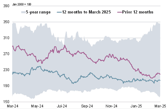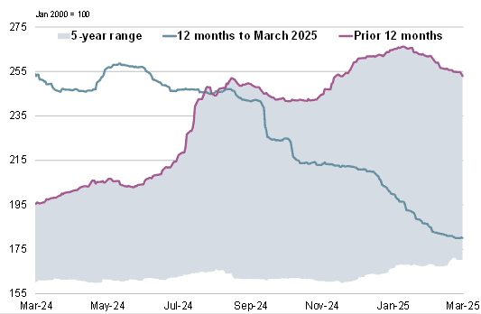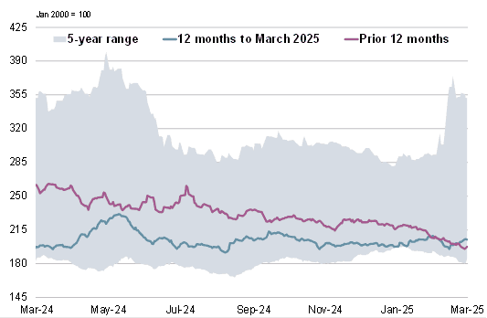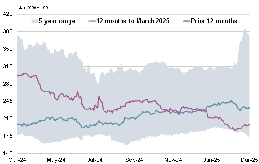 Хотя часть более ранних, более резких спадов была частично компенсирована в последние недели, индекс GOI IGC снизился на 2% по сравнению с февральским GMR.