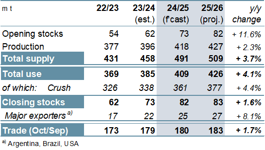 Связанный с обильными урожаями в США и Бразилии, мировой объем производства соевых бобов в 2024/25 году зафиксирован на рекордном уровне, на 22 млн тонн выше, чем в предыдущем году. На фоне значительных запасов и потребление, и запасы, как ожидается, достигнут новых пиков, в то время как мировой спрос на импорт, как ожидается, будет расти за счет более крупных или превышающих средний уровень поставок в Европу, Африку и Азию. Связанный с незначительным приростом площадей и трендовой урожайностью, производство может достичь максимума в 2025/26 году, при этом общее использование увеличится за счет более устойчивого спроса со стороны кормового, пищевого и промышленного секторов во многих регионах. Ожидается рекордная торговля, рост на 2% в годовом исчислении.