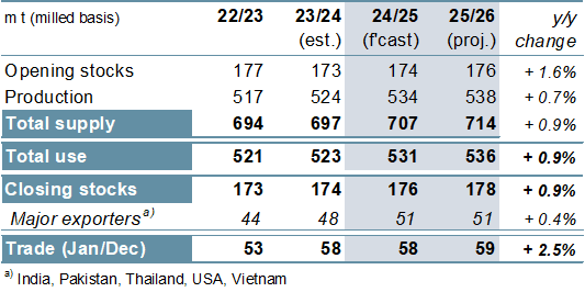 В значительной степени отражая перспективы более устойчивого спроса на 100%-ный рис после отмены индийских экспортных ограничений, прогноз торговли рисом в 2025 году повышается примерно на 1 млн т до пика в 58 млн. Исходя из прироста посевных площадей и трендовой урожайности, прогнозируется, что мировое производство увеличится до максимума в 2025/26 году. Что касается спроса, то и потребление, и торговля, как ожидается, достигнут соответствующих рекордов, в то время как ожидается скромный рост запасов, в основном за счет накопления в Китае.