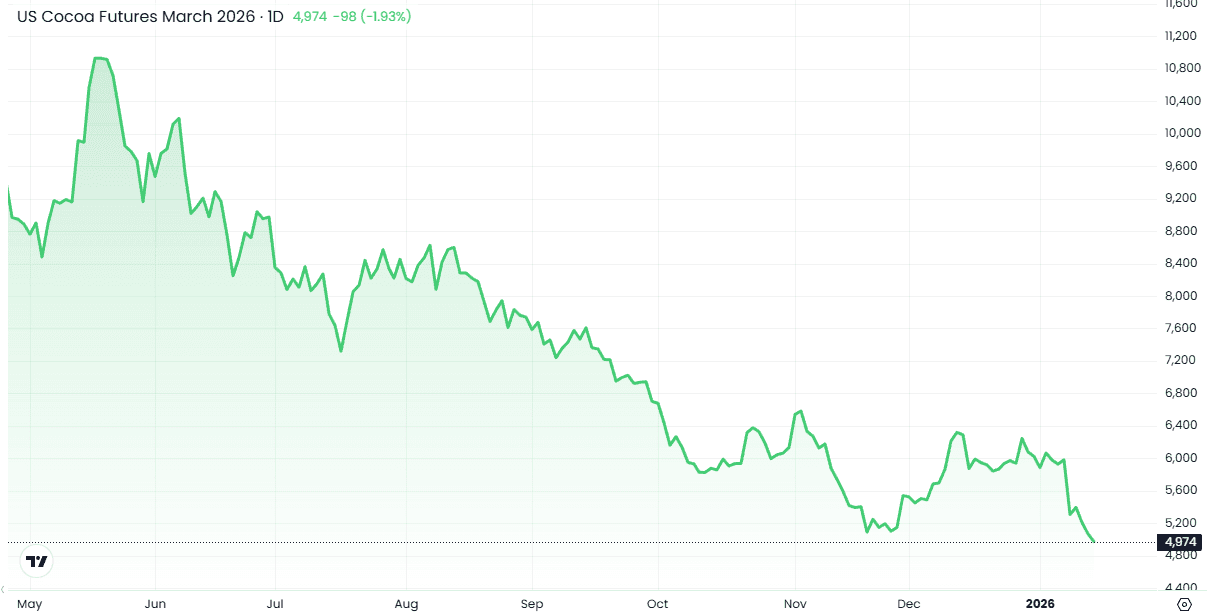 Цены на какао в Нью-Йоркское снизились на 124 доллара, или на 2,4%, до 4966 долларов за метрическую тонну после падения до 4839 долларов, самого низкого уровня почти за два года.