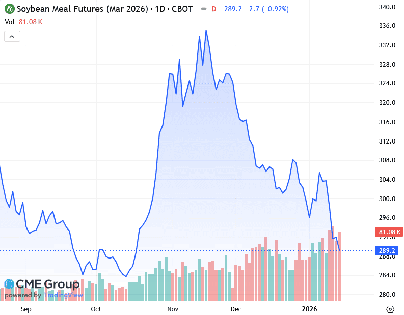 Фьючерсы на соевый шрот снизились, при этом мартовские фьючерсы на соевый шрот на CBOT закрылись с понижением на 2,70 доллара, или 0,9%, до 289,20 доллара за короткую тонну.