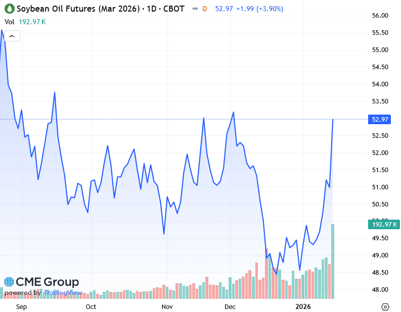 По данным источников, знакомых с планами, спрос на соевое масло ускорился на фоне новостей о том, что администрация президента США Дональда Трампа планирует окончательно утвердить квоты на смешивание биотоплива с топливом на 2026 год к началу марта.