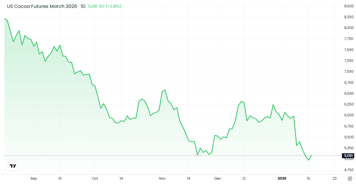 Цена закрытия Какао в Нью-Йорке составила 5076 долларов за метрическую тонну, поднявшись на 110 долларов, или на 2,2%, после падения в четверг до почти двухлетнего минимума в 4839 долларов. За неделю контракт потерял 5%.