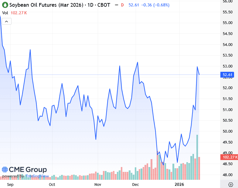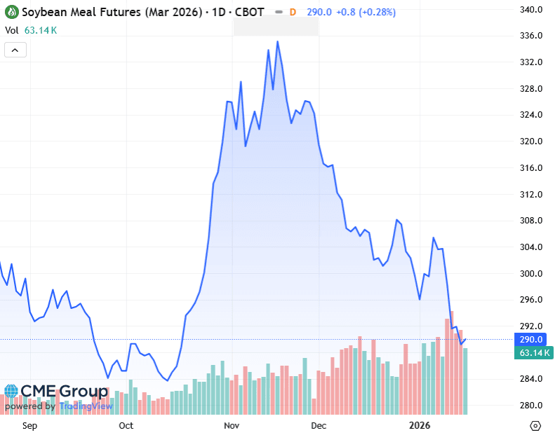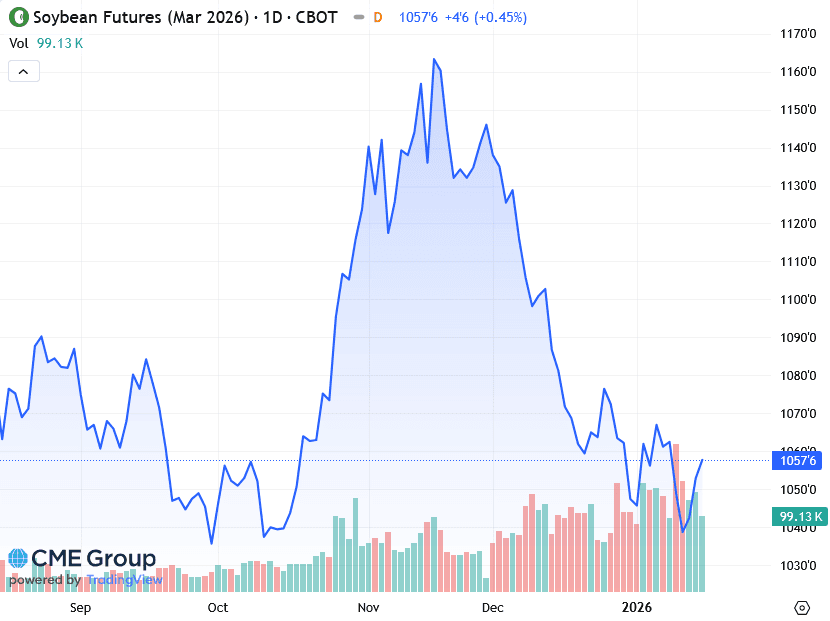 Цены на баржи с соей, загруженные в январе на условиях CIF, выросли на 3 цента и составили 99 центов по сравнению с фьючерсами на сою SH26 на CBOT в марте. Цены на баржи, загруженные в феврале, также выросли на 3 цента и составили 98 центов по сравнению с мартовскими фьючерсами.