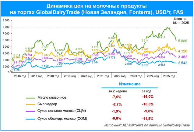 По итогам прошедших торгов средняя цена контрактов (в долларовом эквиваленте) на поставку СЦМ остается ниже уровня середины ноября 2024 г. на 9,8%, сыра чеддера – на 10,5%, СОМ – на 11,8%, сливочного масла – на 16,0%. Значение среднего индекса GDT опустилось ниже уровня прошлого года на 11,1% (-137 пт.).