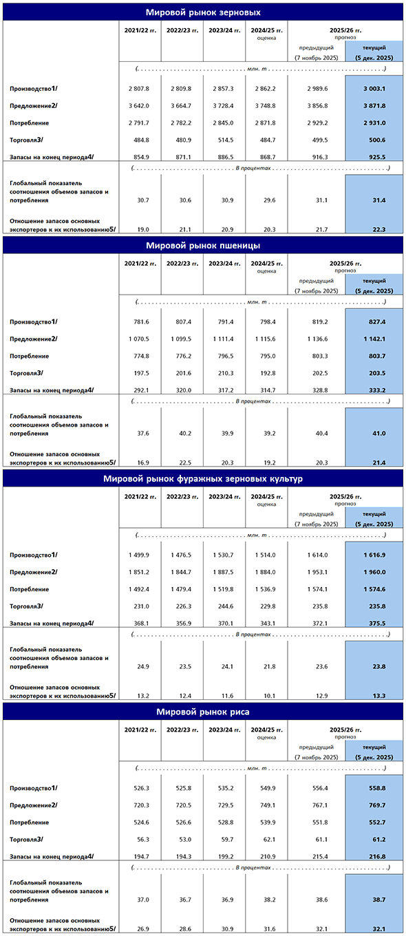 Прогноз ФАО по объему производства зерновых в мире в 2025 году в этом месяце был повышен до 3 003 млн тонн, и, таким образом, ожидаемый объем производства в мире может впервые превысить 3 млрд тонн. Пересмотр оценок по объему производства пшеницы в сторону повышения в первую очередь обусловлен улучшением видов на урожай, прежде всего в Аргентине, где, в силу благоприятных погодных условий и более значительных, чем прогнозировалось ранее, посевных площадей, ожидается рекордный урожай. Кроме того, в сторону увеличения были пересмотрены прогнозы по объемам производства пшеницы в Европейском союзе и Соединенных Штатах Америки. Чуть менее значительной корректировке в сторону повышения подверглись ожидания по объему производства фуражных зерновых в мире, прежде всего ячменя. Что касается риса, то ФАО повысила свой прогноз по объемам производства в Индонезии по сравнению с ноябрьским уровнем: согласно официальным оценкам, урожай в этой стране в межсезонный период может оказаться выше, чем ожидалось ранее, вследствие продолжающегося расширения посевных площадей. С учетом улучшения прогнозов по урожаю в Бангладеш и Японии прогноз по объему мирового производства риса в сезоне 2025–2026 года был увеличен на 2,4 млн тонн до 558,8 млн тонн (в пересчете на обрушенное зерно). Таким образом, объем производства риса в мире может оказаться на 1,6 процента выше результата сезона 2024–2025 годов, достигнув нового рекордного уровня. Как ожидается, основной объем прироста обеспечат Бангладеш, Бразилия, Китай, Индия и Индонезия, с лихвой компенсировав сокращение производства на Мадагаскаре, в Непале, Пакистане, Таиланде и Соединенных Штатах Америки.