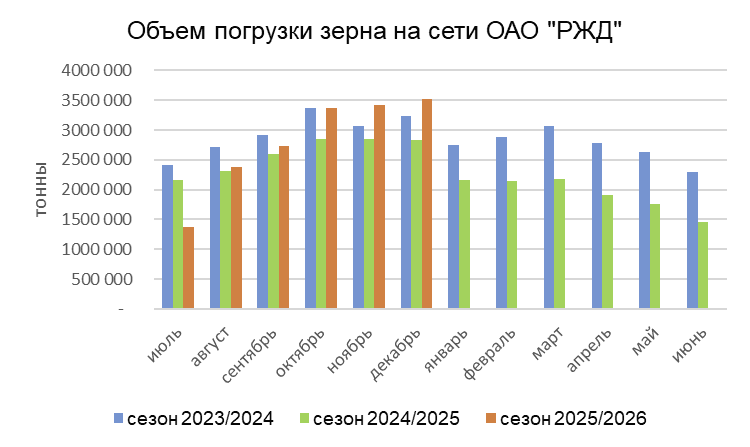 В первой половине текущего сезона (июль-декабрь 2025 г.) было перевезено 16,779 млн т зерна, что больше, чем за аналогичный период в прошлом сезоне (15,610 млн т), но меньше, чем в сезоне 2023/2024 (17,719) млн т.