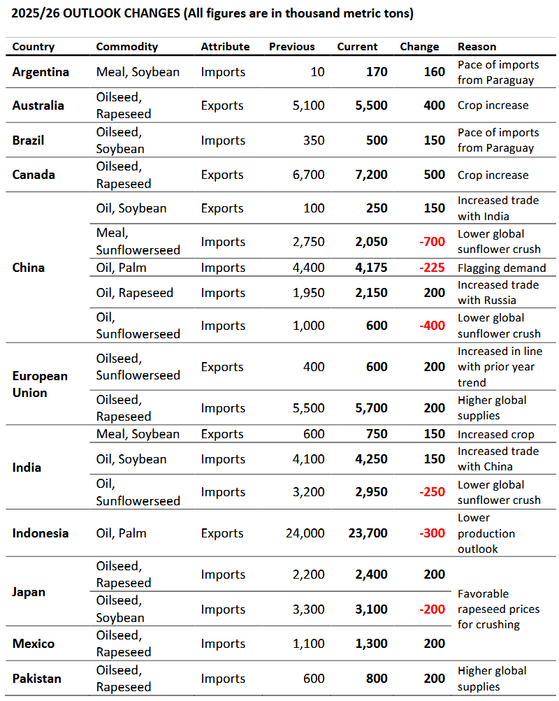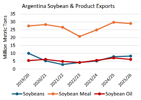 Экспорт соевого шрота из Аргентины в 2025/26 МГ прогнозируется на уровне 29,0 млн. тонн, в то время как экспорт соевого масла прогнозируется на уровне 6,2 млн. тонн. Ожидается, что объемы экспорта обоих продуктов будут выше, чем в предыдущие годы, но ниже, чем в 2024/25 году. Это является следствием более низкого ожидаемого производства сои, на 2,6 млн тонн меньше, чем в прошлом году, до 48,5 млн тонн, но также меньше соевых бобов, доступных для переработки на внутреннем рынке с октября по март, прежде чем запасы будут пополнены к урожаю 2025/26 года.
