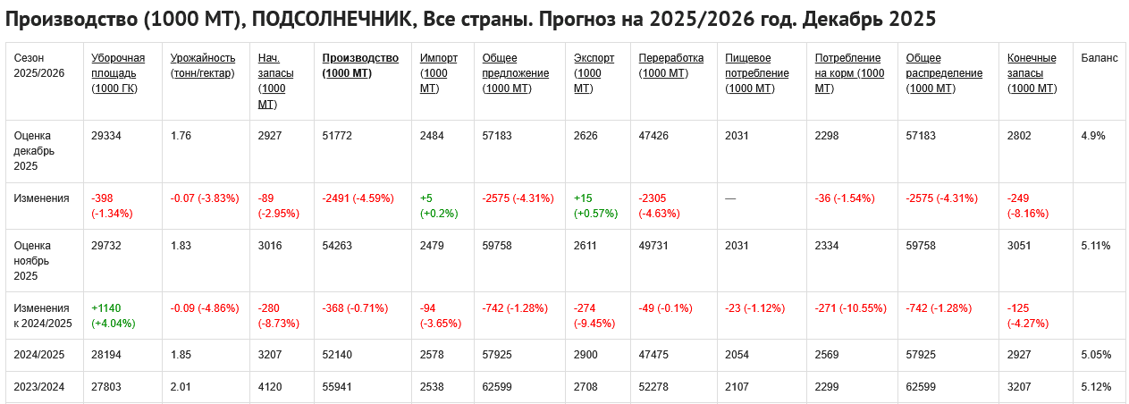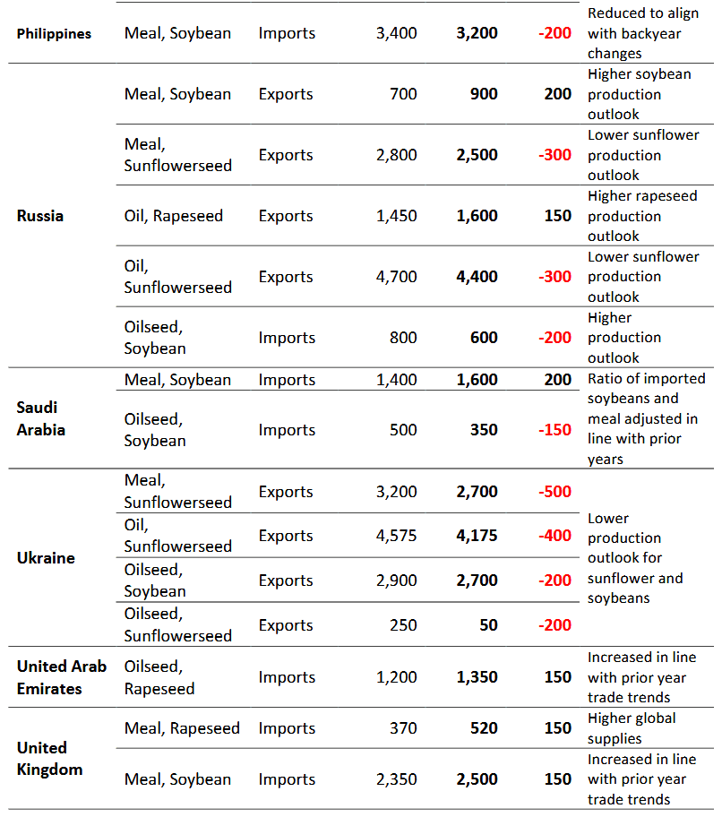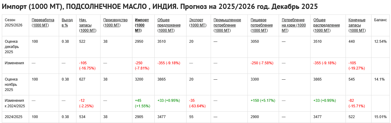 Прогноз мирового производства масличных культур в этом месяце повышен в связи с ростом производства рапса в Канаде и Австралии, а также производство арахиса в Нигерии с лихвой компенсировало снижение производства подсолнечника в Украине и России. Мировая торговля масличными культурами увеличилась благодаря увеличению экспорта рапса из Канады и Австралии, что более чем компенсировало снижение Украина экспортирует сою. Мировое производство снизилось из-за снижения цен на подсолнечник в Украине и России, что не компенсируется ростом цен на рапс в Канаде и России. Мировые запасы масличных культур увеличились на фоне роста цен в Канаде вынос семян рапса. Мировые продажи белкового шрота снижаются из-за сокращения экспорта подсолнечного шрота из Украины и России. Мировая торговля растительными маслами снижается из-за экспорта подсолнечного масла из Украины и России, что не компенсируется увеличением экспорта рапсового масла из России и соевого масла из Китая. Запасы растительного масла практически не изменились, так как снижение продаж пальмового и подсолнечного масел было в значительной степени компенсировано ростом продаж соевого, рапсового и пальмоядрового масел, сообщает oilworld.ru со ссылкой на USDA.