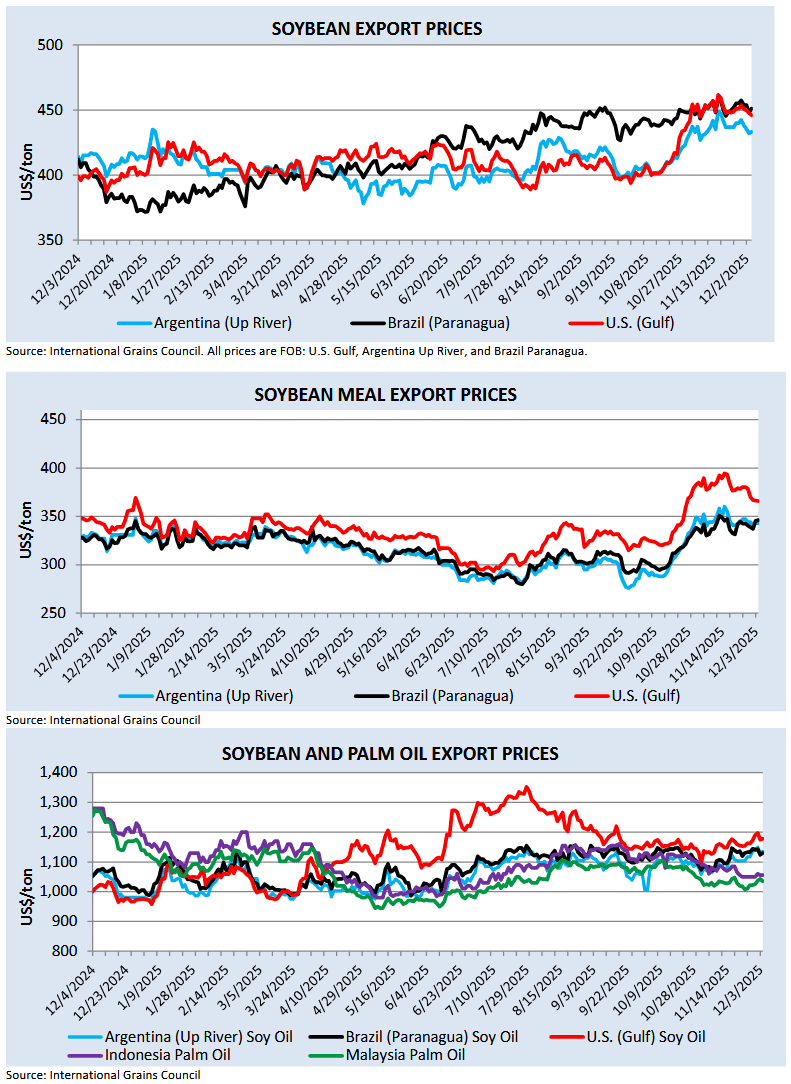 После значительного повышения цен на соевый шрот в октябре в результате изменения цен на цены на соевые бобы и соевый шрот снизились. Снижение курса доллара США в последние недели помогло снизить надбавки в США к шроту южноамериканского происхождения. Рекордный объем экспорта аргентинских соевых бобов в Ноябрь и продолжающиеся поставки из Бразилии продолжают сокращать запасы сои в Южной Америке, что оказывает поддержку ценам на соевый шрот у основных экспортеров. Цены на соевое масло выросли у всех основных экспортеров в связи с сокращением запасов сои в Аргентине. Пальмовое масло повысило свой статус в качестве мирового масла со скидками по мере накопления запасов в Малайзии, в то время как Индия замедлила закупки в последние месяцы