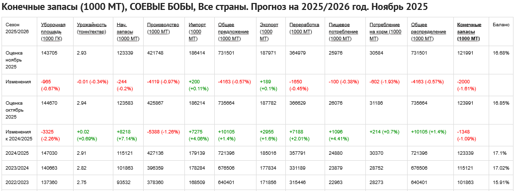 В отчёте содержалось примечание: «В связи с прекращением государственного финансирования с 1 октября по 12 ноября некоторые обычно используемые источники данных в США оказались недоступны для публикации WASDE (Оценки мирового сельскохозяйственного предложения и спроса) за ноябрь 2025 года. Изменения в балансах США по-прежнему отражают все данные правительства США, доступные на момент публикации, но в этом месяце в некоторых случаях эта информация была ограничена».
