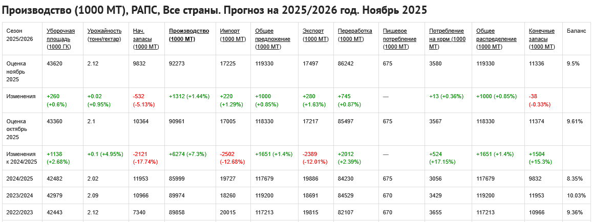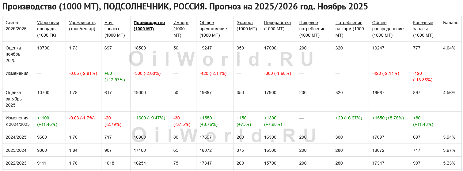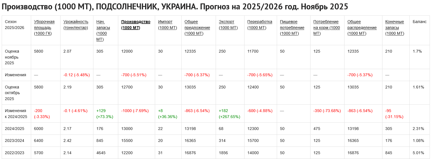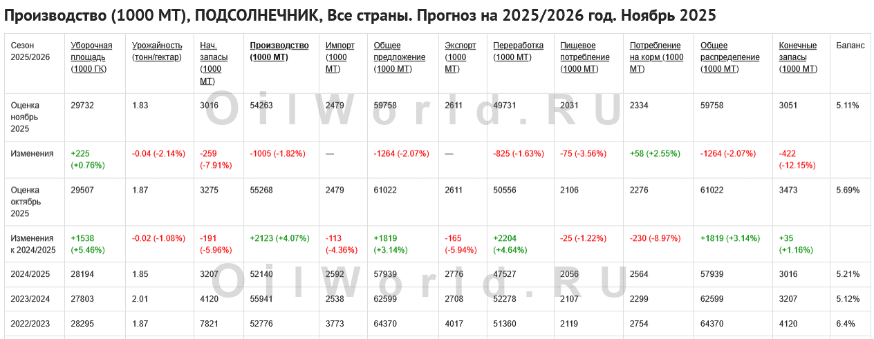 Подробнее: Производство (1000 МТ), ПОДСОЛНЕЧНИК, Все страны. Прогноз на 2025/2026 год. Ноябрь 2025