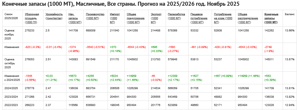 Согласно отчёту, мировые конечные запасы масличных культур в 2025–2026 финансовом году составят 142,26 млн тонн, что ниже сентябрьской оценки в 145,01 млн тонн. Министерство прогнозирует объём мировой торговли масличными культурами в 214,49 млн тонн, что выше сентябрьского прогноза в 213,79 млн тонн, сообщает oilworld.ru.