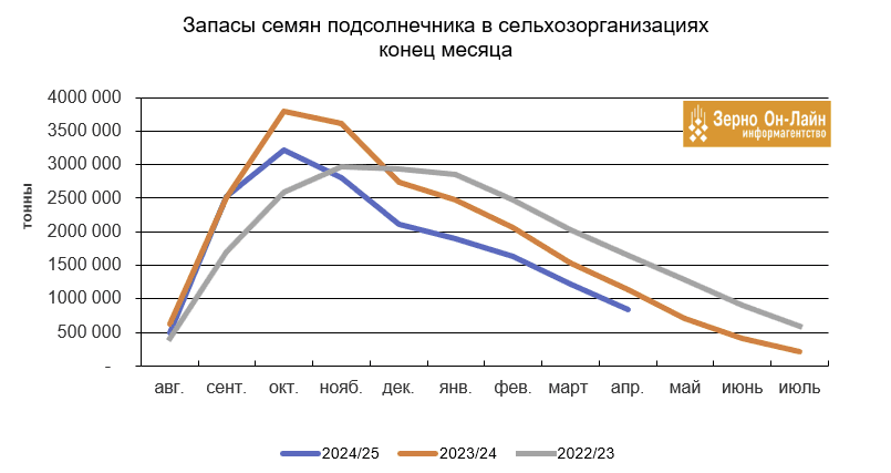 По данным на конец апреля 2025 г. запасы масличных культур в сельхозорганизациях РФ снизились до 2,275 млн т, что на 3,9% меньше, чем годом ранее. Об этом сообщает агентство Зерно Он-Лайн со ссылкой на Росстат. Запасы подсолнечника снизились на 26,3% до 839,1 тыс. т.