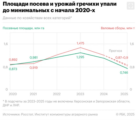 Так, в 2023 году был поставлен рекорд — было собрано 1,475 млн т грехичи с 1,295 млн га площадей. А в 2025 году было засеяно только 0,746 га. По прогнозу с них соберут 0,87–0,9 млн т гречихи.
