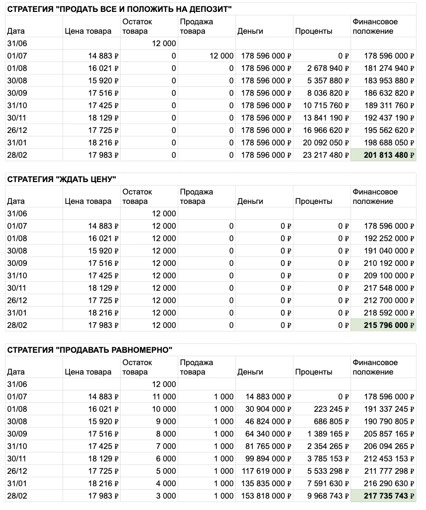 Как посчитать, какая стратегия лучше? Мы на каждую дату будем оценивать финансовое положение фермера - сумму денег на счетах, начисленных процентов по депозиту и текущей стоимости оставшихся запасов пшеницы.