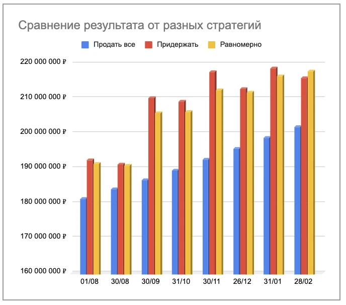 Стратегия продать все сразу и положить на депозит прибавляет по 3 млн рублей каждый месяц, но все еще сильно отстает от двух лидирующих стратегий.
