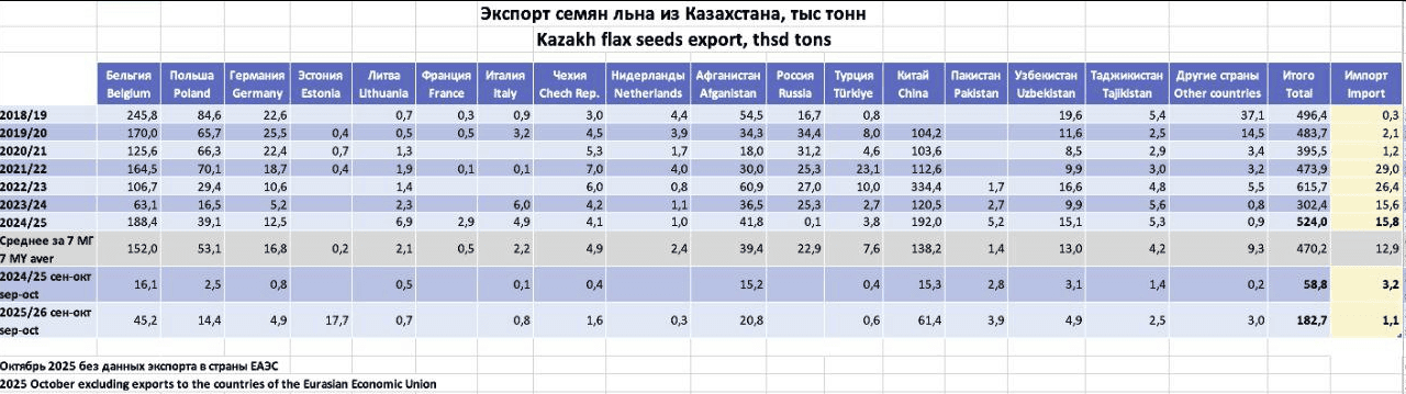 Расширенные актуальные данные по экспорту семян льна из Казахстана за сентябрь-октябрь 2025/26 МГ