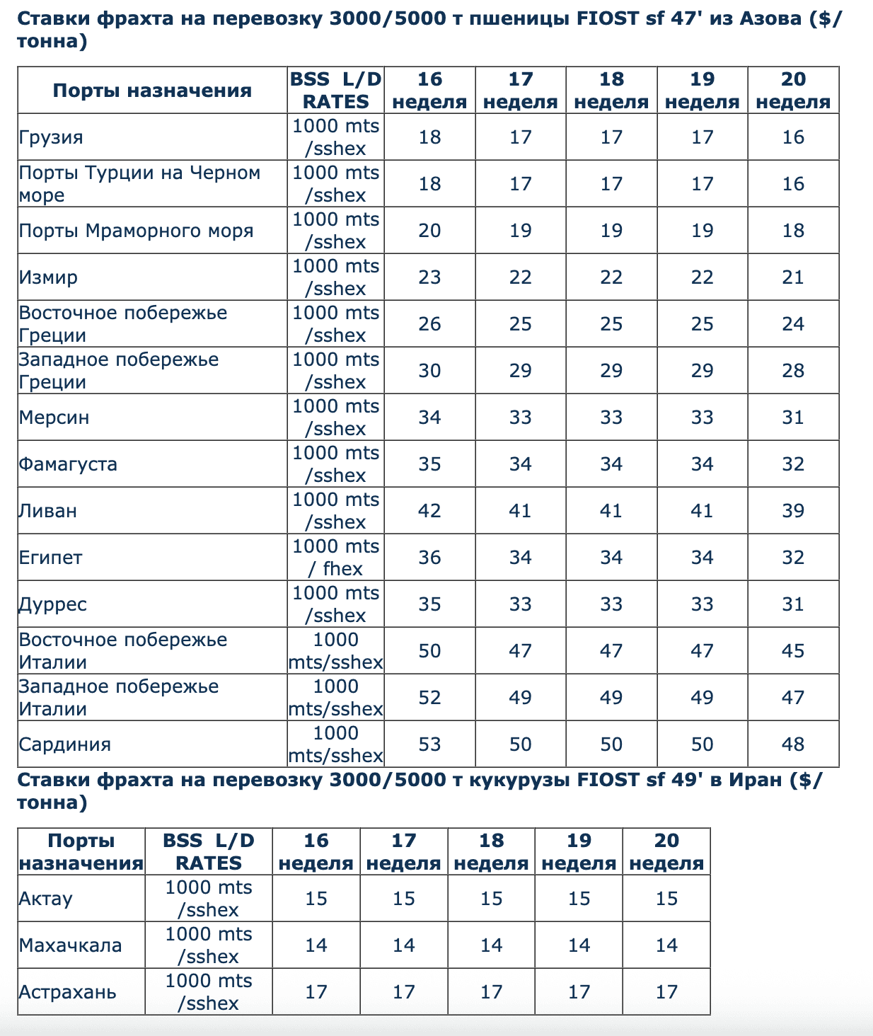 На 20-й неделе ставки фрахта в Азово-Черноморском регионе опустились до 18 долларов за тонну при отправке 3000 тонн пшеницы из Азова на порты Мраморного моря. На рынке сохраняется низкая активность, экспортерам очень сложно заключать запродажные контракты, хотя активные просчеты идут как с портов Азова, так и с других речных портов. Для отправок на порты Мраморного моря фрахтователи называют рабочие уровни в 16 долларов за тонну, однако при таких ставках рейсы становятся не рентабельными для судовладельцев.