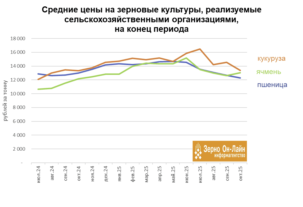 В октябре 2025 г. средняя цена ячменя, реализуемого российскими сельхозорганизациями, выросла до 13035 руб./т, что на 3% больше, чем в сентябре 2025 г. и на 7% больше, чем в октябре 2024 г. Об этом сообщает агентство Зерно Он-Лайн со ссылкой на Росстат.