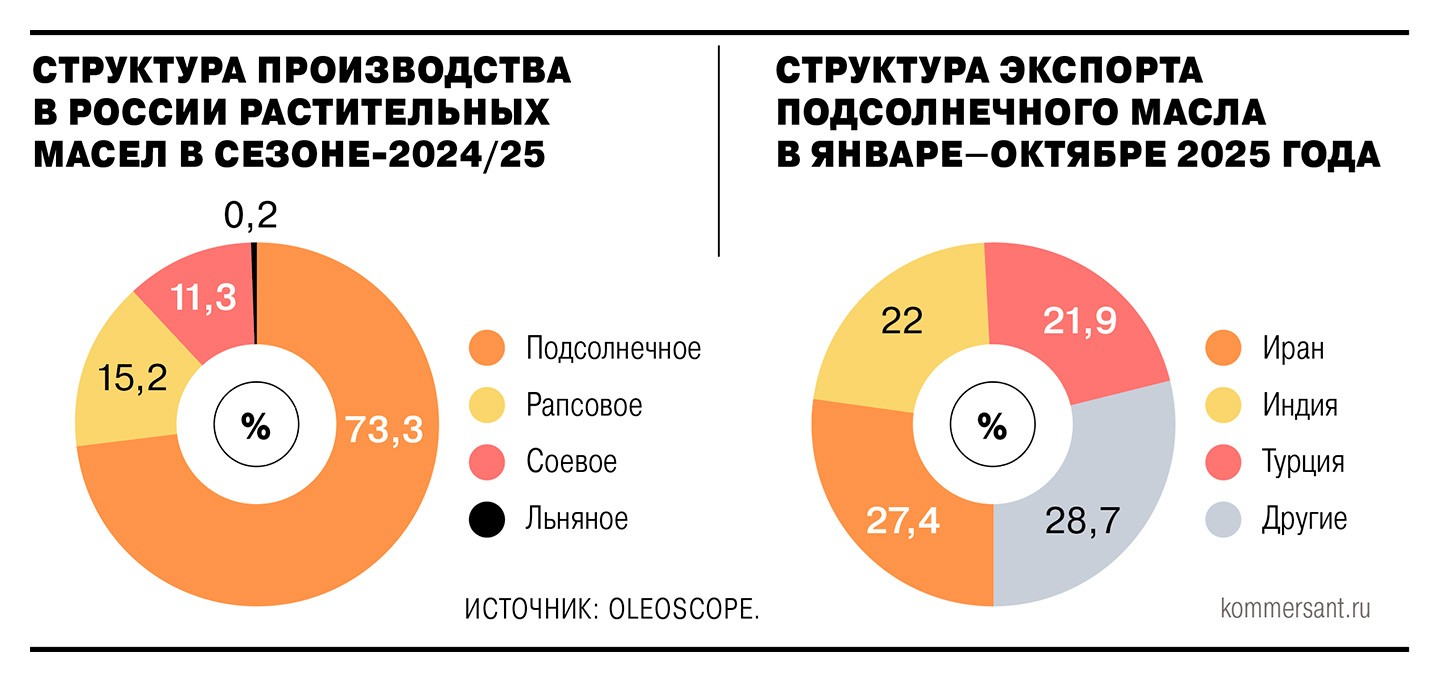 Согласно OleoScope, экспорт из России в январе—октябре составил 3,45 млн тонн, потеряв 29% год к году. Дмитрий Краснов, впрочем, основным фактором сокращения поставок считает не мировые цены, а механизм плавающей пошлины, размер которой увеличивается пропорционально росту цен за предыдущий месяц.