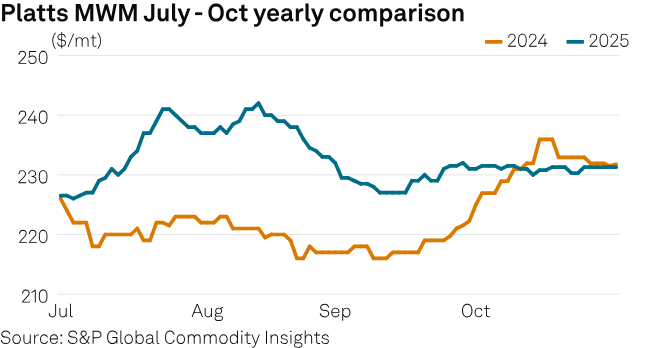 Средняя цена на мукомольную пшеницу Platts в октябре составила 231 доллар за тонну по сравнению с 229 долларами за тонну в сентябре, что было обусловлено устойчивым спросом на поставки в ноябре и начале декабря, укреплением рубля, погодными условиями и отрицательной маржой.