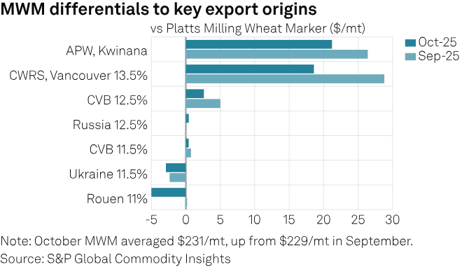 В октябре украинские цены, к которым добавлена надбавка за нормализацию качества в размере 3,28 доллара за тонну из-за более низкого содержания белка, впервые с момента запуска маркера установили MWM. Это произошло после того, как цены на российскую пшеницу с середины октября выросли из-за укрепления рубля, составив в среднем 0,42 доллара за тонну надбавки к MWM. В течение месяца цены на украинскую пшеницу в 57% случаев превышали MWM.