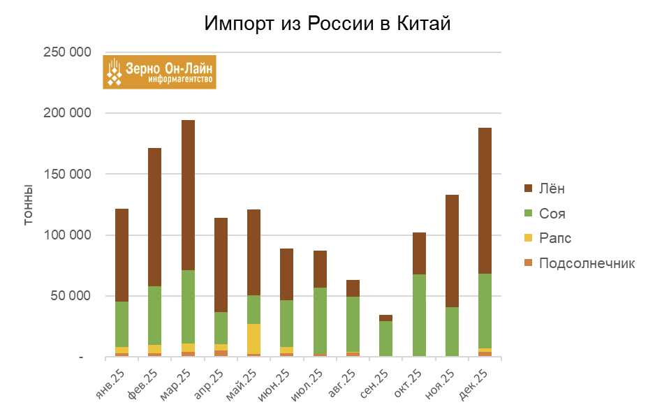 В 2025 г. Китай импортировал из России 801,6 тыс. т семян льна, что в полтора раза больше, чем в 2024 г. Об этом сообщает агентство Зерно Он-Лайн со ссылкой на Таможенное управления Китая.