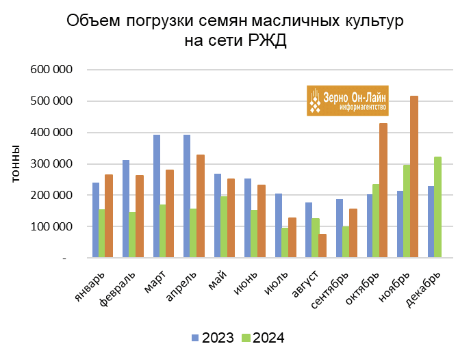 В ноябре объем погрузки семян масличных культур на сети РЖД превысил 0,5 млн т