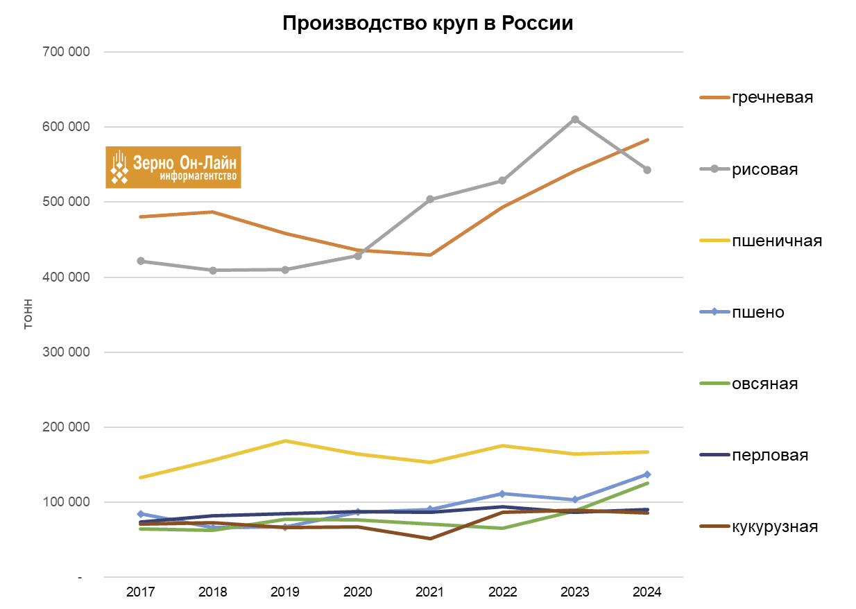 Производство рисовой крупы в прошлом месяце достигло 67,3 тыс. т, гречневой –60,8 тыс. т, крупы из пшеницы – 15,8 тыс. т, пшена – 14,3 тыс. т, перловой крупы – 9,8 тыс. т.