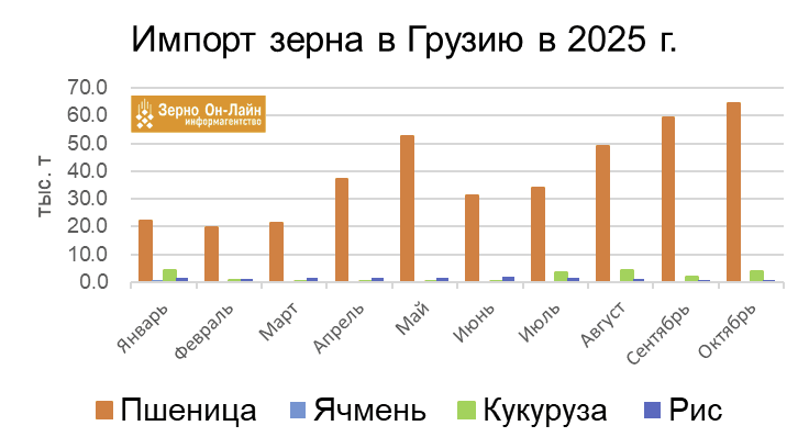 В октябре 2025 г. Грузия импортировала 69,8 тыс. т зерна суммарной стоимостью 17,8 млн долларов США, сообщает агентство Зерно Он-Лайн.