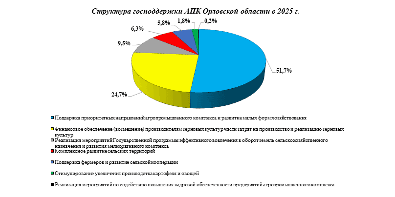 По данным Минсельхоза России, господдержка агропромышленного комплекса Орловской области в 2025 году составила 1 054,56 млн руб., в том числе из федерального бюджета — 965,10 млн руб., из регионального — 89,46 млн руб. Было освоено 100% выделенных субсидий.