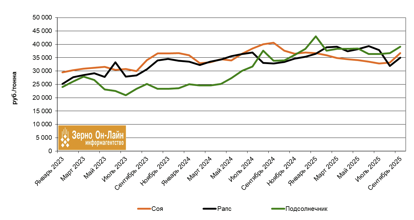 По сравнению с сентябрем 2024 г. средняя цена подсолнечника выросла на 16%, рапса – на 6%. Соя за год подешевела на 10%.