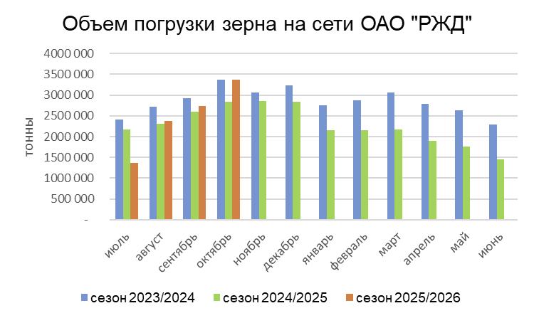 Объем погрузки зерна в октябре 2025 г. составил 3364,4 тыс. т, в т.ч. пшеницы – 2624,4 тыс. т, ячменя – 324,6 тыс. т, чечевицы – 92,9 тыс. т, гороха – 73,3 тыс. т, кукурузы – 58,6 тыс. т.