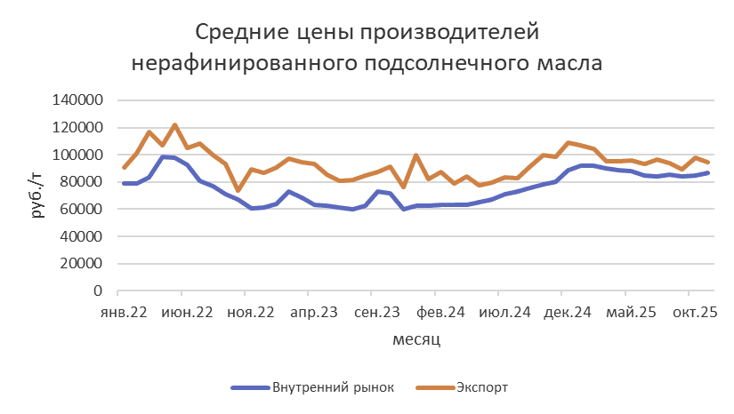 В ноябре 2025 г. средняя цена производителей на нерафинированное подсолнечное масло на внутреннем рынке достигла 86426 руб. за тонну, что на 7% больше по сравнению с ноябрем 2024 г. Об это сообщает агентство Зерно Он-Лайн со ссылкой на Росстат.