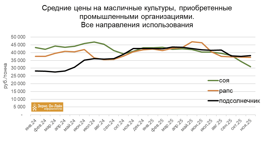 По сравнению с ноябрем 2024 г. средняя закупочная цена сои уменьшилась на 24,1%, подсолнечника – на 10,7%, рапса – на 8,8%.